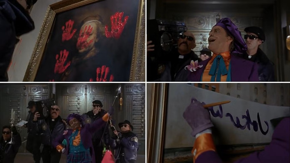 В супергеройском фильме Тима Бертона есть множество ошибок, но одна из самых серьезных происходит, когда Джокер и его команда портят картины в музее. Один из членов его банды бьет по картине руками, покрытыми красной краской, но в следующем кадре отпечатки рук исчезают с произведения искусства.