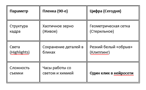 - Профессиональная пластика: И на близком, и на дальнем плане бот одинаково эффективно борется с «таблицей Excel» (подробнее смотри в 1главе)., заменяя плоские цифровые пиксели на живое органическое зерно пленки 35mm.