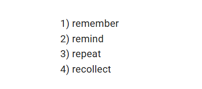 recollect Что проверяют в этом задании? В заданиях 30–36 важно не просто знать перевод слов, а понимать, как они работают в предложении: нужен ли после глагола предлог, требуется ли дополнение, уместен ли он по стилю. Давайте разберем каждый вариант отдельно. Это самый нейтральный и частотный глагол. Он может использоваться: Важно: после remember не требуется обязательного дополнения в виде местоимения (me, you, us). Можно просто сказать Remember! — «Помни!» или «Запомни!». А вот здесь — внимание