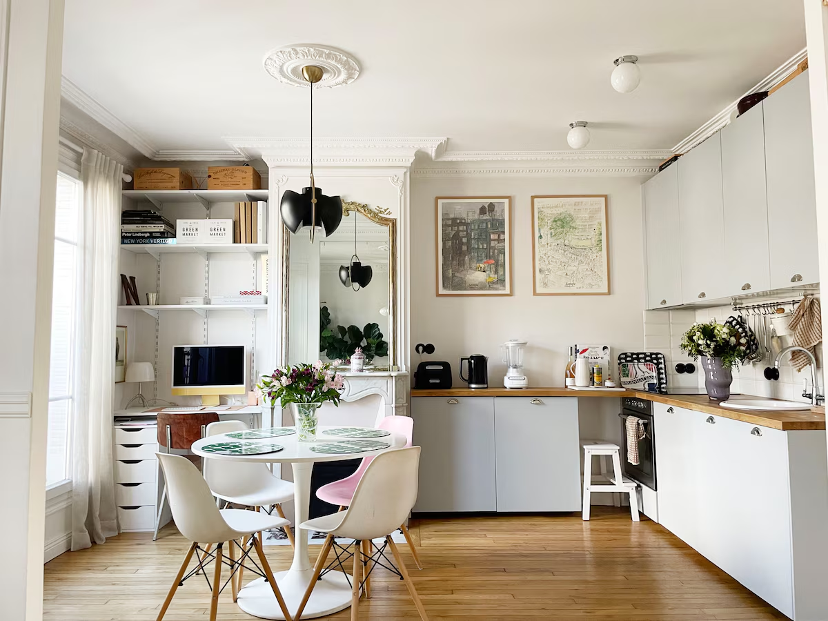 Французская кухня часто 2–2,5 метра длиной. Нет рабочего треугольника: холодильник в комнате, рабочая поверхность 40 см, мойка крошечная. Это не минимализм — это наследие эпохи, когда дома почти не готовили.