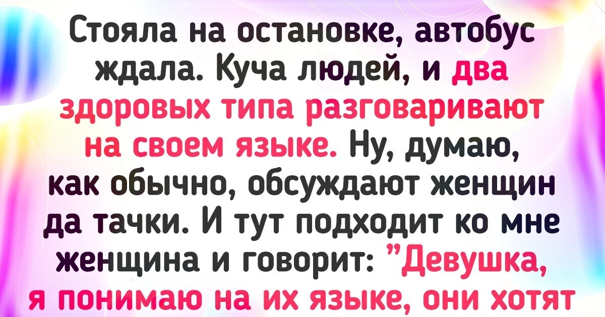 Стояла на остановке, автобус ждала. Куча людей, и два здоровых типа разговаривают на своем языке. Ну, думаю, как обычно, обсуждают женщин да тачки. И тут подходит ко мне женщина и говорит: "Девушка, я понимаю на их языке, они хотят у вас телефон украсть, закройте сумку". Спасибо, женщина!
