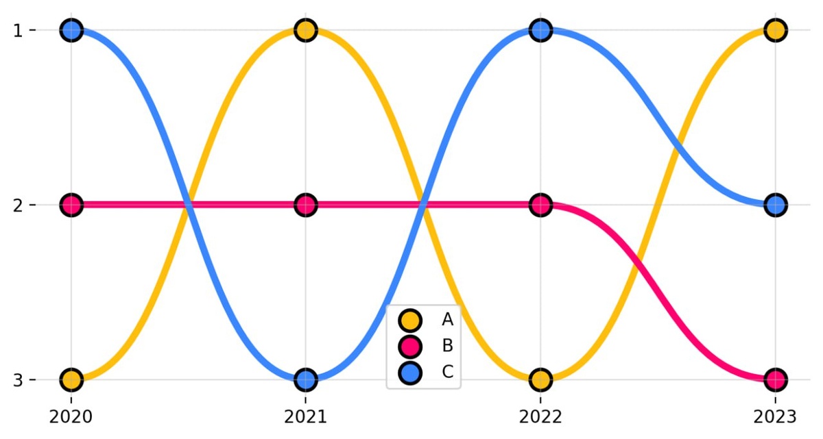 π bumplot β ΡΡΠΎ Python-Π±ΠΈΠ±Π»ΠΈΠΎΡΠ΅ΠΊΠ° Π΄Π»Ρ ΠΏΠΎΡΡΡΠΎΠ΅Π½ΠΈΡ ΡΠ°Π½Π³ΠΎΠ²ΡΡ Π³ΡΠ°ΡΠΈΠΊΠΎΠ², ΠΊΠΎΡΠΎΡΡΠ΅ Π½Π°Π³Π»ΡΠ΄Π½ΠΎ ΠΏΠΎΠΊΠ°Π·ΡΠ²Π°ΡΡ ΠΈΠ·ΠΌΠ΅Π½Π΅Π½ΠΈΠ΅ ΠΏΠΎΠ·ΠΈΡΠΈΠΉ ΠΎΠ±ΡΠ΅ΠΊΡΠΎΠ² Π²ΠΎ Π²ΡΠ΅ΠΌΠ΅Π½ΠΈ