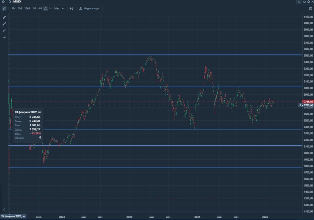 Рынок не живёт в отрыве от реальности. Реальность на графике говорит, что за 4 года , если не считать дивидендов наш рынок стоит на месте. Увы и ах. Удвоениями до конца СВО там и не пахнет. 🤷 Посмотрим на цифры 📊 До 2022 года индекс МосБиржи торговался в диапазоне 3600–4200 пунктов, а Мосбиржа анонсировала выпуск бейсболок "МОЕХ 5000". В конце 2021 года капитализация рынка составляла порядка 62,8 трлн рублей, а сегодня капитализация 54 трлн, а индекс закрепился в районе 2700–2800 пунктов (-20% от уровней "До" и на "50% ниже целей, обозначенных В.Путиным в 2024 году"). 👥Инвесторы тоже изменились. До 2022 года объёмы торгов иностранными акциями превосходили торги российскими, сейчас 100% торгов идёт российскими акциями — импортозаместили 💪 Главное тектоническое изменение произошло в структуре инвесторов. Если в 2021 году иностранцы держали российских акций на сумму около 86 млрд$ и обеспечивали 48–60% объёма торгов, то сейчас их доля стремится к нулю на рынке акций и составляет л