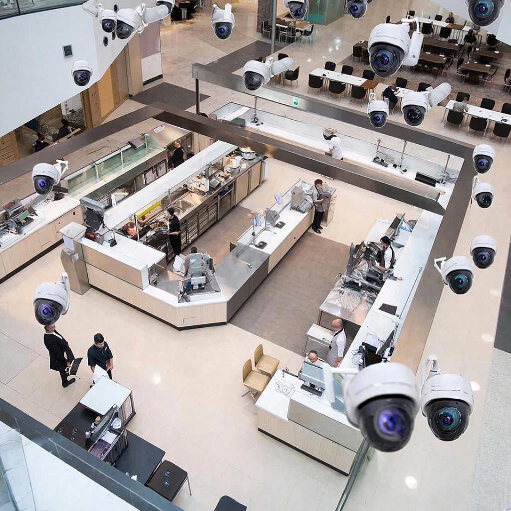 - Небольшое кафе (до 50 м²): 2–4 камеры. Вход, касса, зал, кухня. - Кафе средних размеров (50–150 м²): 4–8 камер. Дополнительно — боковые зоны, туалеты не снимают. - Фудкорт / открытая зона 200–500 м²: 8–20 камер в зависимости от планировки и количества точек продажи. - Большие фудкорты и торговые галереи: комбинируют фиксированные камеры и 1–2 PTZ для гибкой слежки — итог 20+ камер.