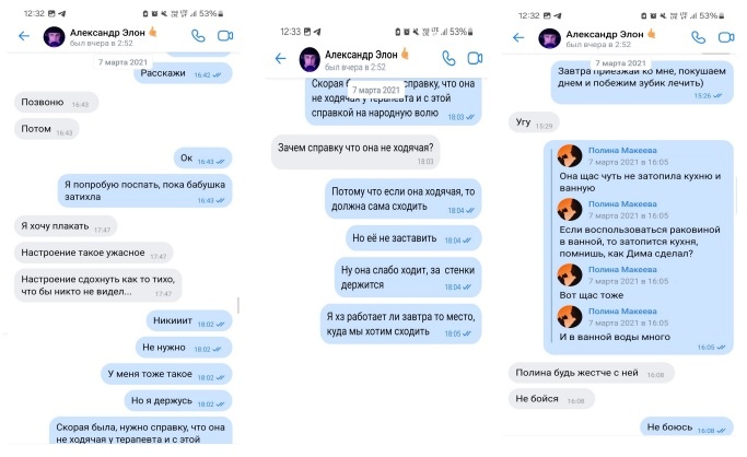 Забыла описать падения с кровати больных. Падали они раза три и каждый раз лежали на полу до тех пор, пока не приходила помощь. Один раз вызвала на помощь МЧС тётя Надя для тёти Оли. И правильно сделала! Один раз дочка позвала знакомых парней. Один раз Таня, приходящая работница социальной службы, помогла. Тётя Надя нашла по телефону социальную службу, заключили договор на оказание помощи по весьма доступным ценам. Татьяна показала многое по уходу. Её приходы очень поддерживали всех. Дочка защитила диплом. Тяжело он ей дался. И в срок с трудом успела оформить. Она же ещё работала курьером в Яндекс доставке каждый день после учебы. Зимой мерзла. Зачем ей эта работа нужна была? Чтобы не быть рядом с больными. Насколько это тяжело было для неё видно из скриншотов переписки с друзьями.