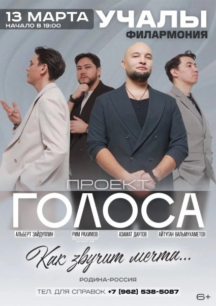 (6+) Вокальный проект «Голоса» — ведущие солисты Башкирского государственного театра оперы и балета, дарят уникальную программу: популярная классика, любимые советские песни в авторском прочтении, потрясающее многоголосье и «живой звук». Мы приглашаем вас прикоснуться к настоящему искусству без фонограммы. Нач. 19:00 Билеты в продаже в кассе Учалинской филармонии, цена 600 р. Касса работает в будние дни с 10:00 до 19:00, перерыв14:00-15:00 Справки по 8 347 912 06 24, 8 962 538 50 87 Источник https://uchaly102.ru/?p=126910