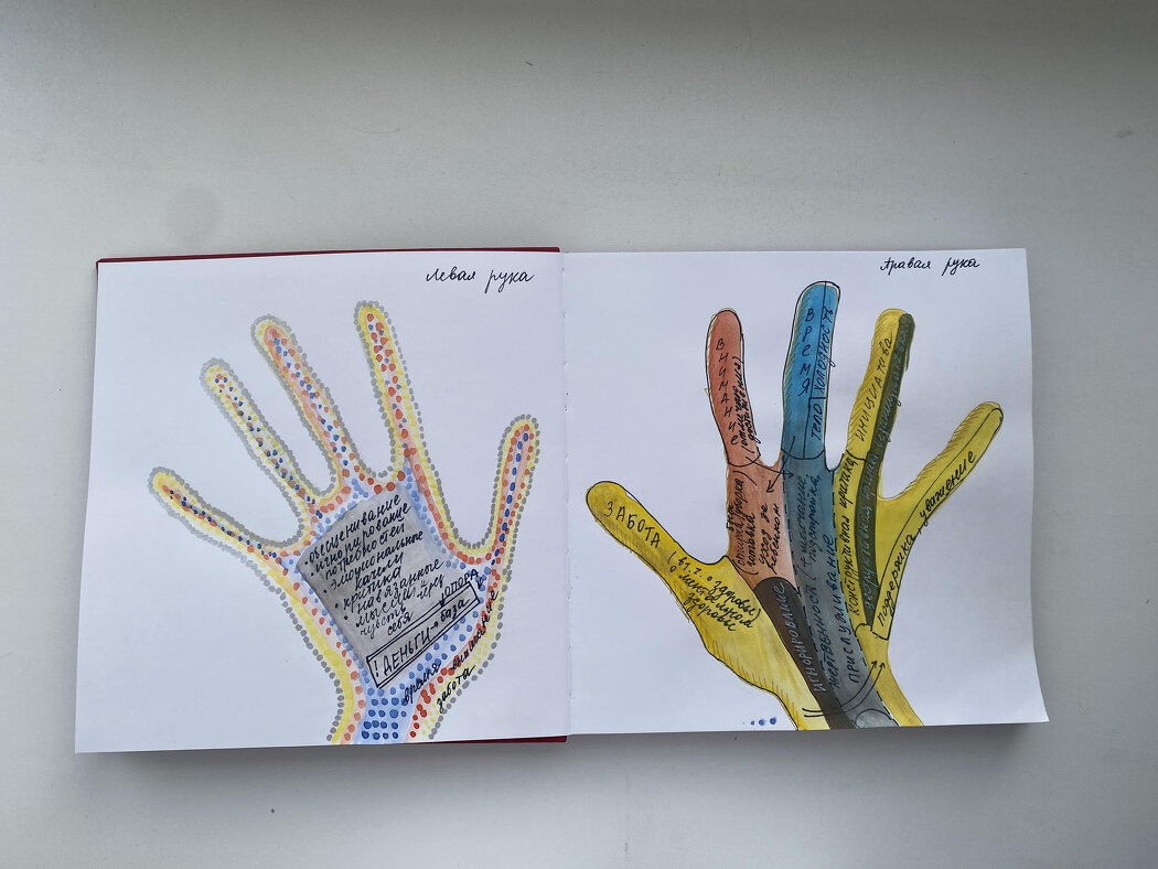 Перед выполнением арт-терапевтической практики, мой личный запрос звучал так: исследовать баланс "давать/брать" в текущих отношениях с мужем. Изначально задача была в том, чтобы обвести обе свои ладони. Затем заполнить левую так, чтобы это символически отражало то, что я беру в этих отношениях, а правую - чтобы это символически отражало то, что я даю в этих отношениях. Вот что у меня получилось. Если анализировать левую и правую ладони, то можно сделать вывод, что "отдаю" я в отношениях больше, чем "беру". Безусловно это отражает мои отношения в реальной жизни. Может показаться, что в таком распределении все еще есть эмоции, обида. Но важен контекст: когда я вступала в эти отношения у меня не было тех знаний из области психологии, которыми я обладаю сейчас. У меня есть все основания полагать, что мой муж относится к типу людей с расстройством нарциссического спектра. И именно поэтому все эти "даю" в его случае всегда связаны со взглядами на мир через призму этого самого нарциссизма. Се