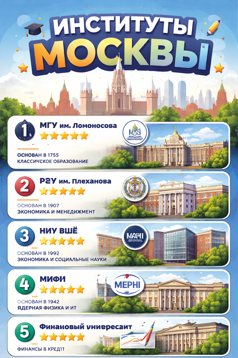 Москва — это город, где на одном метре кв. стоит три университета. Всё вокруг кричит: "Поступай в НИУ ВШЭ!", "МГУ — элита!", "МИФИ — для гениев!". Но где реально учат, а где ты будешь четыре года просиживать в аудитории? Разберём честно: топ-5 институтов, что там учат, сколько места на бюджете, и стоит ли платить деньги.