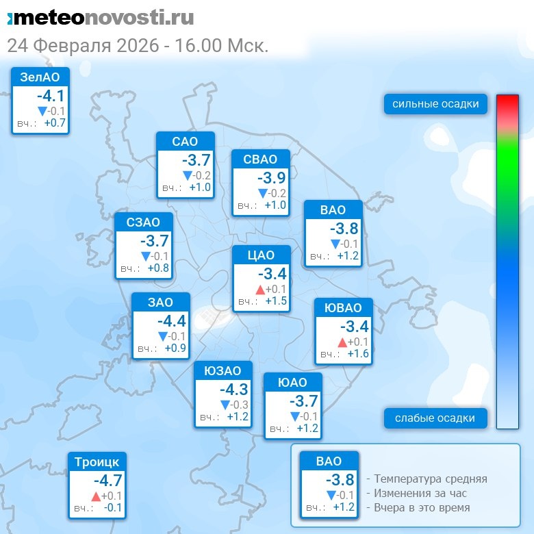 В 16:00 в Москве было от -5.1°C до -2.8°C, средняя температура -3.8°C #погода #Москва #зима #температура #24февраля #вторник