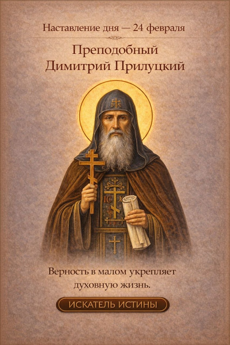 Преподобный Димитрий Прилуцкий В этот день Церковь вспоминает преподобного Димитрия Прилуцкого — ученика преподобного Сергия Радонежского и основателя Спасо-Прилуцкого монастыря. Его жизнь стала примером монашеского послушания и мирного устроения братии. Преподобный Димитрий стремился к тишине и молитве, но не уклонялся от ответственности. Он основал монастырь в северных пределах Руси, где духовная жизнь требовала особой стойкости и терпения. Главной чертой его служения было смирение. Он не искал первенства, но заботился о братии как отец. Монастырь для него был школой любви, труда и взаимной поддержки. Преподобный учит нас, что духовная жизнь строится на постоянстве. Не внешние подвиги делают человека святым, а ежедневная верность Богу. Память преподобного Димитрия напоминает: мир сердца и послушание — прочное основание всякого доброго дела.