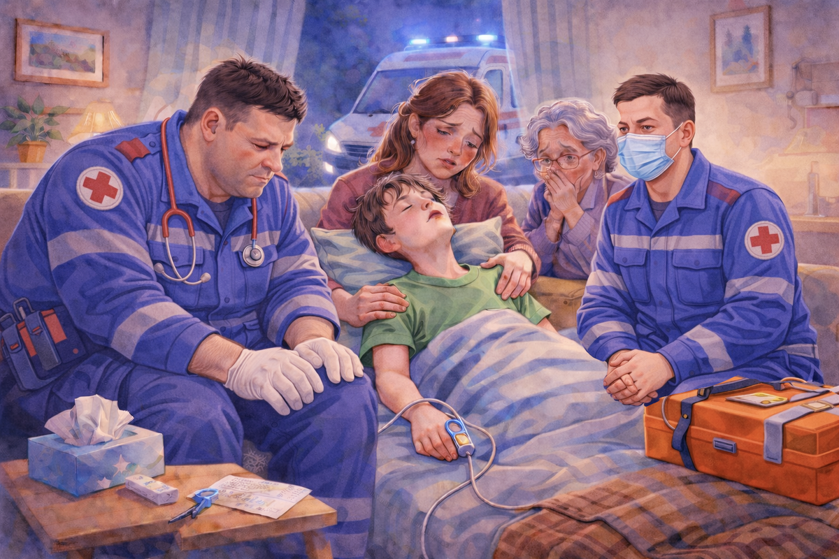 К вечеру четвёртого дня температура возросла до 39,5 градуса, и женщины были вынуждены вызвать скорую помощь. Прибывшие доктора осмотрели, покрутили-повертели, лёгкие послушали, сделали жаропонижающий укол да уехали восвояси.