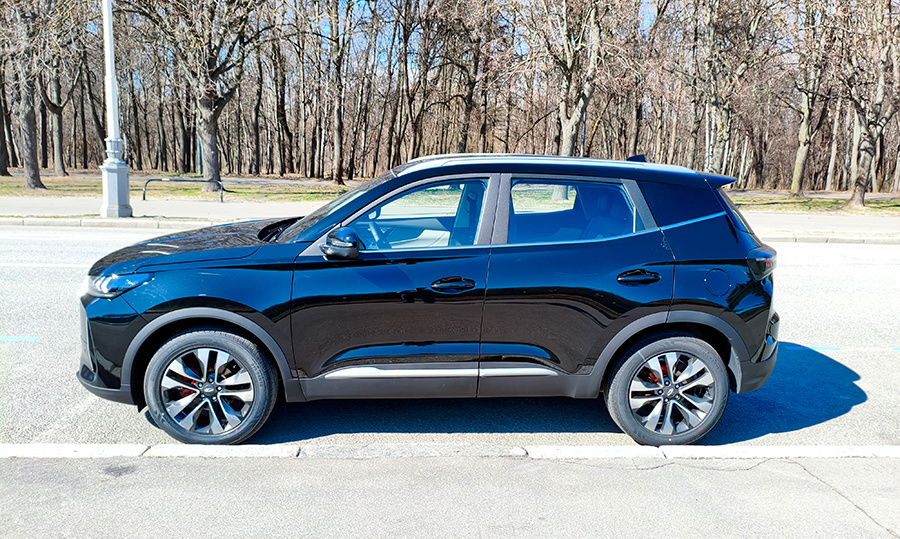 Боковой профиль Chery Tiggo 4 NEW стал более брутальным за счёт более вертикальных линий решётки радиатора и задней двери. Особенно это хорошо видно, когда кузов окрашен в чёрный цвет.