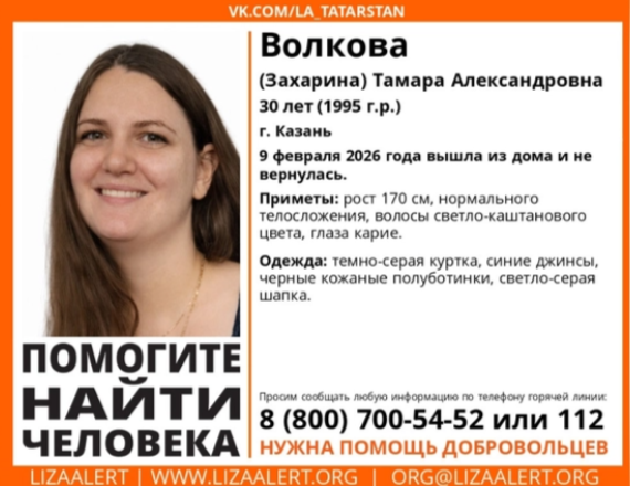 В Казани уже две недели ищут 30-летнюю Тамару Волкову, которая вышла из дома за детской присыпкой и исчезла. Новый след появился только недавно — камеры зафиксировали, как женщина садится в автобус до Зеленодольска. Однако до конечной точки она не добралась: по пути вышла в неизвестном месте, и дальнейшее её перемещение пока не установлено. Тамара ушла из дома 9 февраля, оставив телефон и документы. Она направилась в аптеку на Ленинградской улице, где приобрела присыпку. Фармацевт вспоминала её растерянность и фразу о смерти матери — после чего женщина вышла и пошла в сторону, противоположную дому. Записи камер позже показали, что она села в автобус на остановке «Сквер имени Васильченко» в 11:15. Когда транспорт прибыл в Зеленодольск, среди пассажиров её уже не было. Волонтёры надеются, что кто-то из жителей заметил, где она могла выйти. В поисках участвуют полиция, следователи, кинологи и добровольцы. Пройдено около 200 километров, расклеено свыше 300 ориентировок, но никаких подтверж