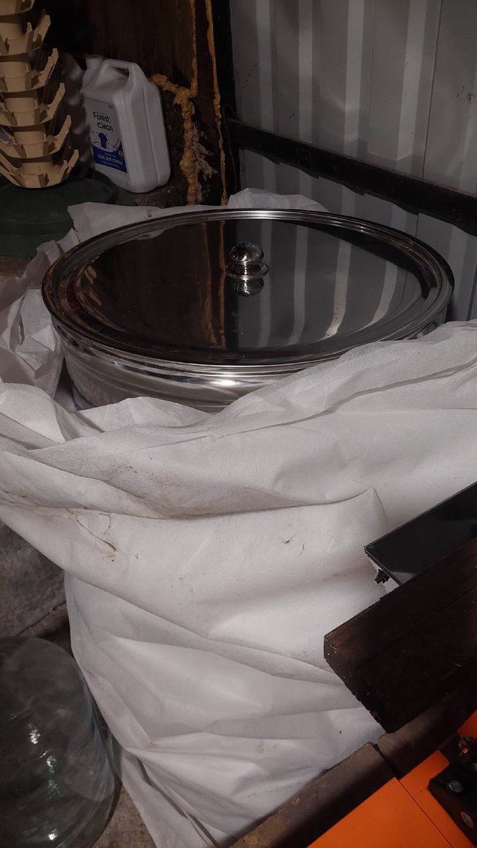 В этом году решили попробовать два других сорта красный Бастардо и белый Ркацители. С Бастардо, как мы с ним не прыгали, дрожжи почему-то не завелись, и виноград ушёл в уксус, пришлось его переварить на сок. На улице похолодало раньше положенного срока, а бочки у нас стоят на улице. Мы пытались его греть, ставили обогреватели, закутывали в нетканку, дважды пытались перезапустить дрожжи, даже сумели оттащить бочку в дом, что бы дрожжам было потеплее, , но всё было зря.
