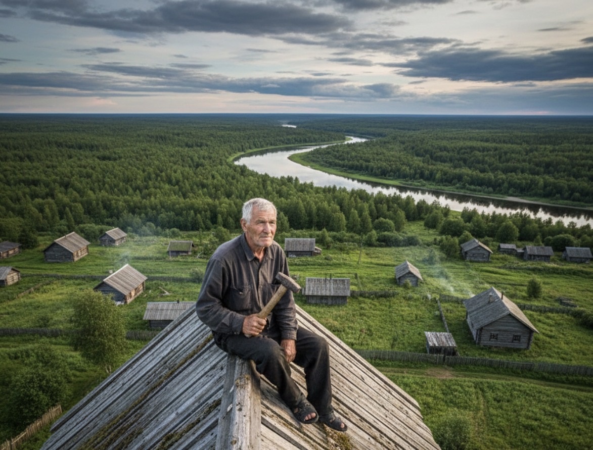 Крыша встретила его запахом старого железа и прогретого дерева. С высоты всё село было как на ладони. Отсюда было видно, как извивается великая река, как зеленеет бесконечная парма, как жизнь течет своим чередом. Степан Иванович осторожно присел на конек, перевел дух. Сердце колотилось, напоминая, что он уже не тот сорвиголова, что крыл этот дом сорок лет назад.