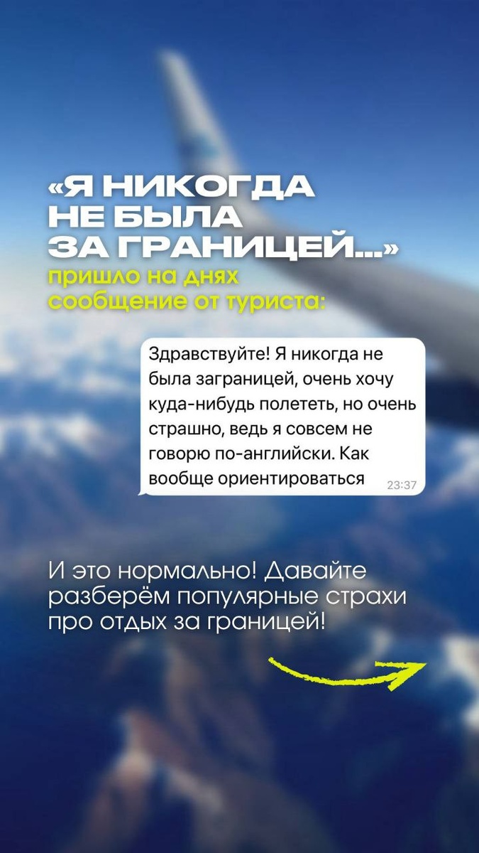 НЕ БЫЛА ЗА ГРАНИЦЕЙ…» пришло на днях сообщение от туриста: «Здравствуйте! Я никогда не была заграницей, очень хочу куда-нибудь полететь, но очень страшно, ведь я совсем не говорю по-английски. Как вообще ориентироваться» 😍И это нормально! Давайте разберём популярные страхи про отдых за границей! ‼️«Я НЕ ГОВОРЮ ПО-АНГЛИЙСКИ» А он вам и не особо нужен. В популярных туристических странах персонал говорит по-русски! В отеле, в трансфере, у гида, который встретит вас по приезде И онлайн-переводчик ещё никто не отменял 😉 ⁉️«А ВДРУГ Я ЗАБЛУЖУСЬ?» В курортных зонах всё просто: карты работают, такси вызывается в приложении, а в отеле всегда подскажут дорогу Самое главное, что вам нужно знать — это адрес и название своего отеля ⁉️«КАК Я ДОБЕРУСЬ ДО ОТЕЛЯ?» В пакетных турах уже включён трансфер в аэропорт и обратно Вы выходите из самолёта, вас встречают и отвозят. Никуда самостоятельно ехать не нужно! ‼️ПЕРВОЕ ПУТЕШЕСТВИЕ — ЭТО НЕ СТРАШНО Это получение новых эмоций! Ставьте +, есл