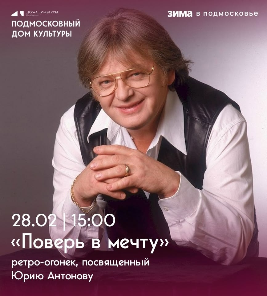 ✨ Уже в эту субботу пройдёт ретро-огонек, посвященный Юрию Антонову «Поверь в мечту» ✨ 📆 28.02.2026🕒15:00 🏢 Подмосковный сельский дом культуры (СДК) 📍 г.о.Домодедово, пос.санатория Подмосковье, д.9 ✅ Мероприятия Домодедово https://dzen.ru/id/66f10385cc4c5a16f7b5fb02 http://vk.com/domodedovo_events http://dzen.ru/domodedovo_events