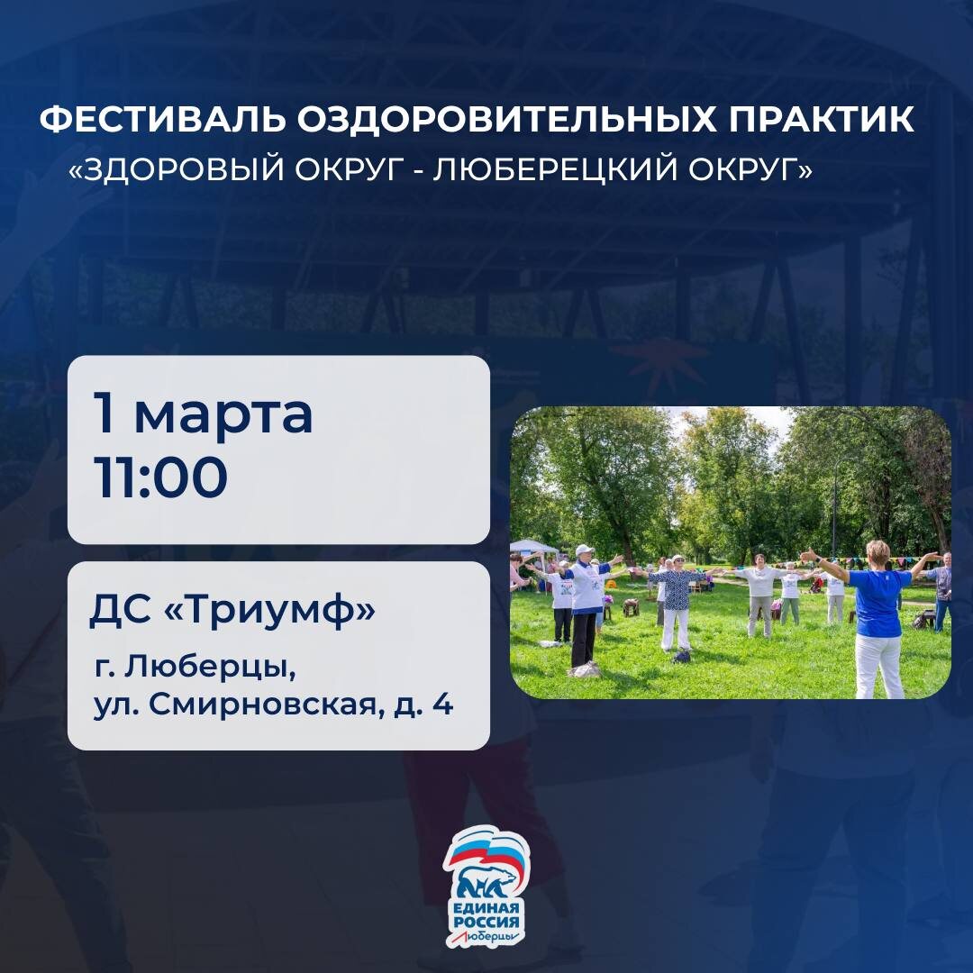 »! «Единая Россия» проведет Семейный фестиваль оздоровительных практик «Здоровый округ — Люберецкий округ» Это день, когда можно попробовать новое, бесплатно проверить здоровье и провести время всей семьёй — активно, полезно и с отличным настроением! В программе: ✨мастер-классы по йоге, нейрофитнесу, суставной гимнастике, дыхательным и телесным практикам ✨обучение первой помощи ✨бесплатный чек-ап здоровья и онкоскрининг полости рта ✨детский и взрослый массаж ✨танцевальный флешмоб и выступления артистов ✨игры для детей ✨настольный теннис, перетягивание каната и многое другое! 📍 Дворец спорта «Триумф» (Люберцы, ул. Смирновская, д. 4) 📅 1 марта ⏰ Старт — в 11:00 Берите друзей, родителей и детей — приходите за энергией, новыми знаниями и вдохновением! Фестиваль организован местным отделением Единой России Люберец в рамках федерального партпроекта «Здоровое будущее». #ЕдинаяРоссия #ЕРЛюберцы #Подмосковье #Люберцы #ЕР50 #ЕРпроекты #ЗдоровоеБудущее 👍 Единая Россия Люберцы 💻ВК | �