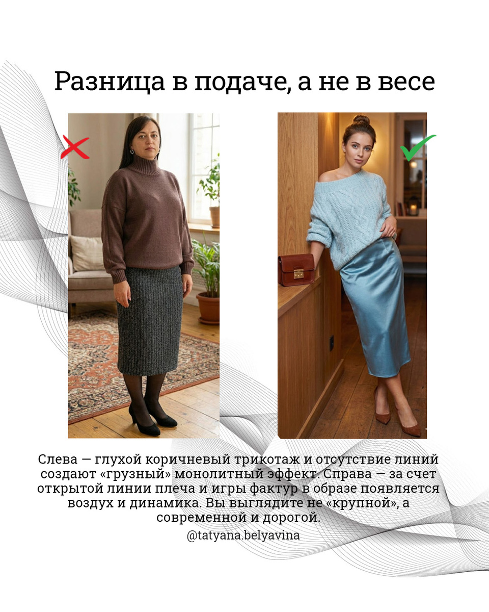 ❌ белое и светлое тоже под запретом. Знакомо? Но если бы это было истиной, мы бы не видели элегантных и стильных женщин в размере plus size.💁 Мы не сравниваем типы фигур. Красота — это не цифра на весах, а умение подать свои данные достойно. Если ваш размер сегодня 50+, это не повод ставить жизнь на паузу и ждать «лучших времен». Стоит научиться одевать свою фигуру мастерски! 💯 Да, параметры могут быть разными, но одежда способна создать визуально новый, гармоничный силуэт. В фигуре + значение имеет всё: каждый сантиметр длины, пропорции, плотность ткани и точность коррекционных техник. Работа действительно ювелирная.👌 Сравните▶️ в подборке: от кроя и комплектации ЗАВИСИТ ваша визуальная стройность. Мы не сравниваем женщин на фото по весу. Мы сравниваем общее впечатление, статус и уверенность, которую транс