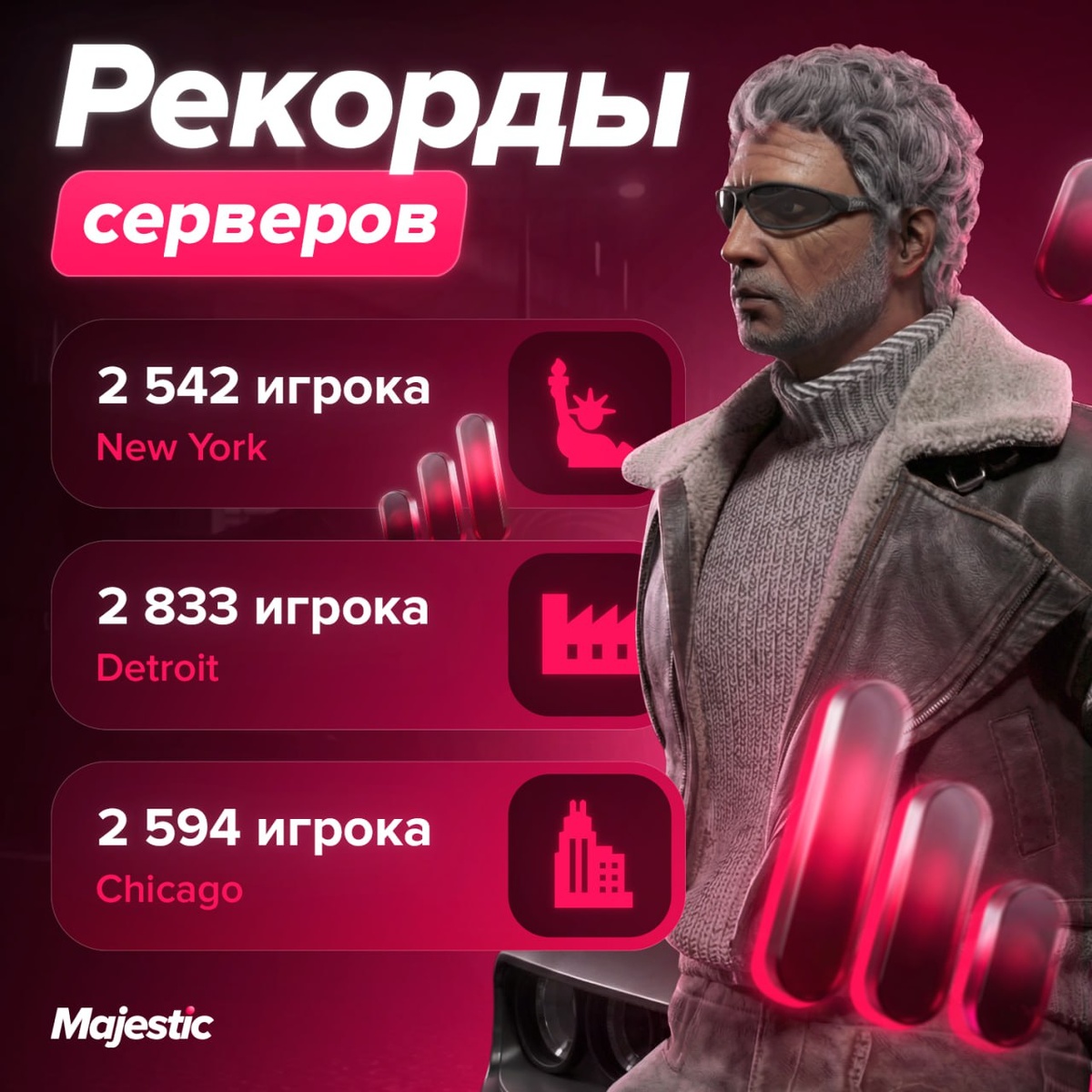Одни из первых серверов проекта не теряют актуальности, а устанавливают свои собственные рекорды онлайна. 👉На сервере New York играли 2542 человека, на Detroit — 2833, на Chicago — 2594. Многие из вас начинали свой путь именно здесь — отличный повод вспомнить друзей, любимые моменты и, возможно, даже вернуться на эти сервера 👆 ❤️ Majestic Role Play