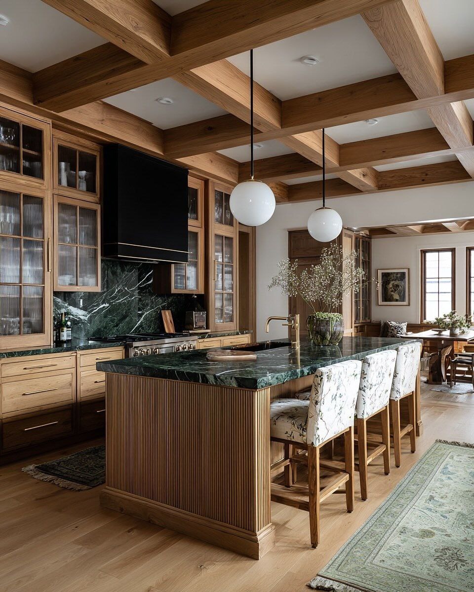 Дизайнеры активно экспериментируют с формами и текстурами деревянных поверхностей, создавая эффектные композиции, сочетающие гладкость лакированных фасадов с рельефностью резьбы и грубоватостью фактуры необработанного массива. Дерево- сердце современного интерьера. Оно давно стало символом тепла и уюта домашнего очага, олицетворяя собой гармонию природы и комфорта человеческого жилища. Сегодня дерево уверенно занимает лидирующее положение среди материалов, формирующих дизайн кухни, поскольку идеально сочетается с камнем, стеклом и металлом, подчеркивая красоту каждого элемента и придавая пространству особую изысканность. Эта игра контрастов позволяет придать кухне индивидуальность и подчеркнуть её связь с общей стилистикой помещения. Особое внимание уделяется интеграции кухонного пространства с гостиной, образуя единый просторный зал. Центральные острова становятся центром притяжения, объединяя вокруг себя всех членов семьи и гостей. Поворотные колонны и модули мебели задают ри