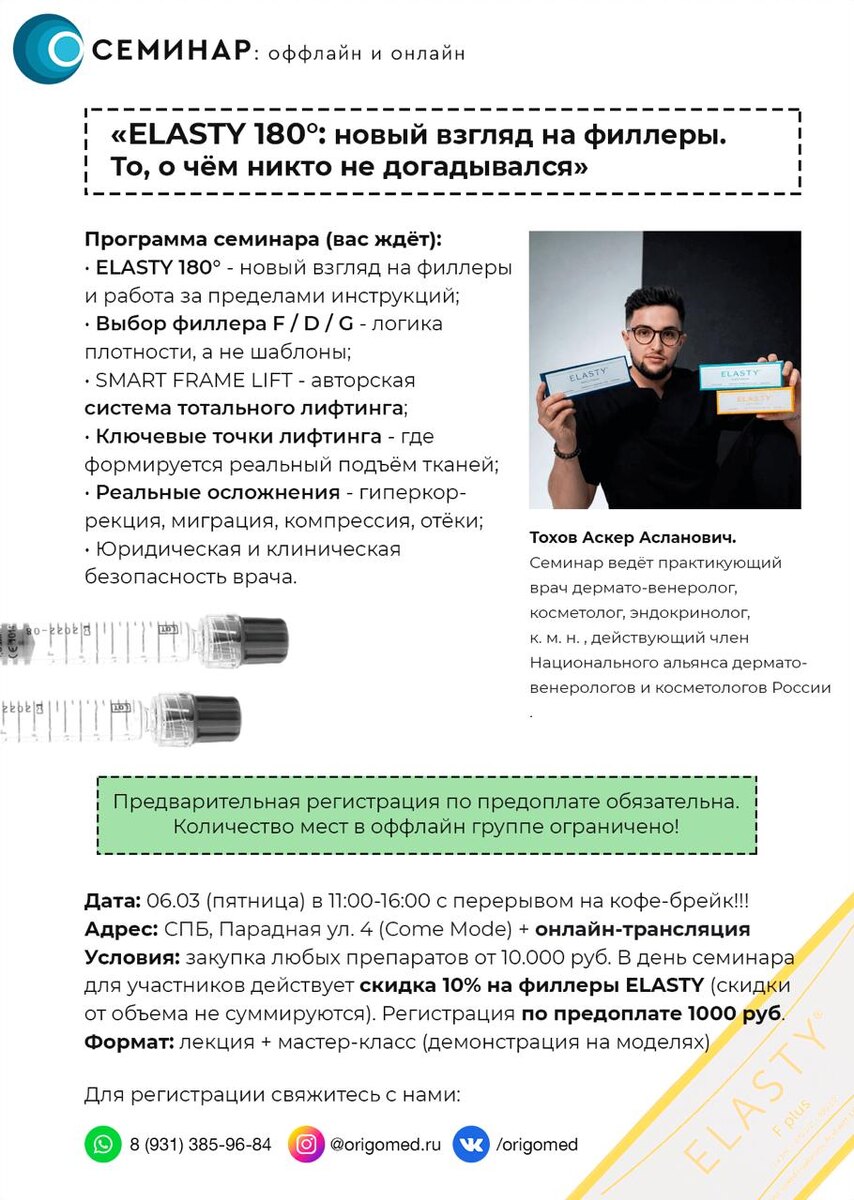 🔥 Друзья! Рады анонсировать долгожданный семинар по филлерам ELASTY на тему: «ELASTY 180°: новый взгляд на филлеры. То, о чём никто не догадывался» 🔥 Пройдёт он 06.03 (пятница) в 11:00. 🏠 Проходит оффлайн в Петербурге + трансляция в высоком качестве для врачей из регионов 💕 👩⚕️ Спикер - Тохов Аскер Асланович - практикующий врач дермато-венеролог, косметолог, эндокринолог, к. м. н., действующий член Национального альянса дерматовенерологов и косметологов. 🔹 Тема: « ELASTY 180°: новый взгляд на филлеры. То, о чём никто не догадывался » 🔹 На семинаре вас ждёт (программа семинара) : • ELASTY 180° - новый взгляд на филлеры и работа за пределами инструкций; • Выбор филлера F / D / G - логика плотности, а не шаблоны; • SMART FRAME LIFT - авторская система тотального лифтинга; • Ключевые точки лифтинга - где формируется реальный подъём тканей; • Реальные осложнения - гиперкоррекция, миграция, компрессия, отёки; • Юридическая и клиническая безопасность врача. Для регистрации нап