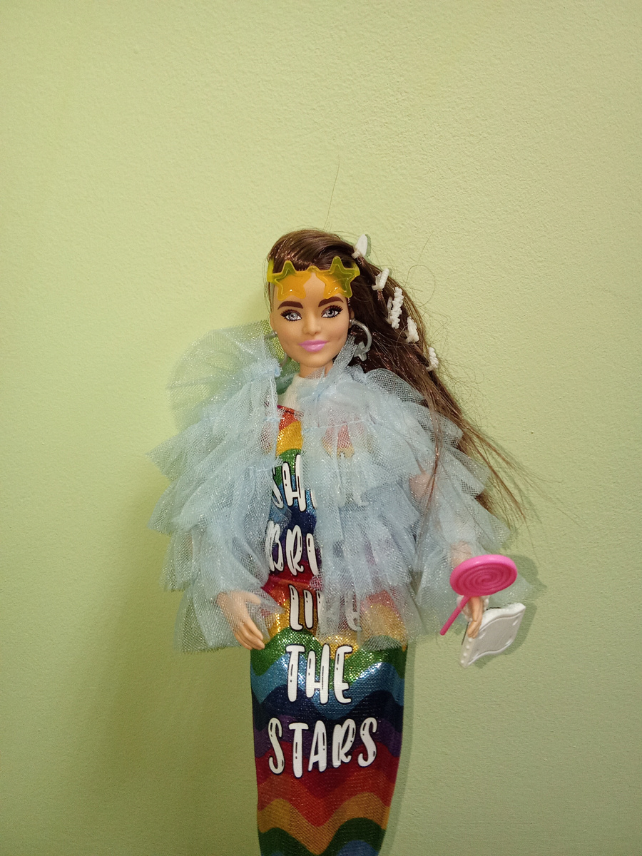 Здравствуйте! Месяц назад, аккурат в пятницу 13-го я заказала эту куклу. Барби -Экстра на молде Вайолет, попросту улыбашка. Раньше я на эту серию смотрела как на какое-то недоразумение: очень пёстрые яркие странные наряды и макияж не нравились мне.
