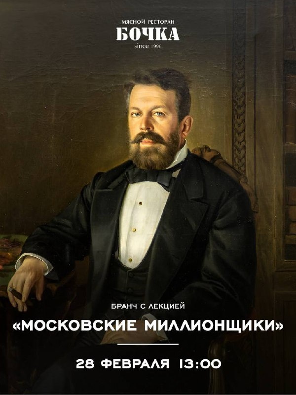 ! 28 февраля приглашаем на бранч с лекцией от гида и краеведа Ольги Вдовиной. Тема мероприятия — «Московские миллионщики. Самые богатые предприниматели дореволюционной Москвы». На лекции вы узнаете о самых крупных московских «миллионщиках» (так в старину называли миллионеров) в начале XX столетия. Как крепостные крестьяне выбивались во владельцев мануфактур, как строились торговые империи, кто владел самыми крупными банки и страховыми организациями империи и где в современной Москве искать следы былых богатств. В гастрономическом меню бранча: – пшенная каша с тыквой, сырники со сметаной, круассан со скремблом и мортаделлой (на выбор); – венские вафли с малиновым соусом; – горячие напитки (чай, кофе); – приветственный аперитив. Время начала лекции: 13:00 (продолжительность — 1 час 30 минут) БРОНЬ МЕСТ
