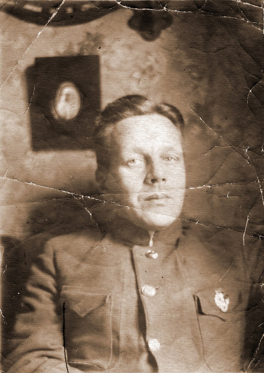 Советский гражданин в закрытом кителе с воротником стойкой и знаком "Ворошиловский стрелок