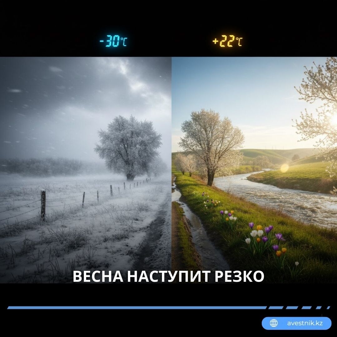 🌡️ Разбег температур от минус 30 градусов ночами в первой декаде марта до плюс 22 градусов днем к концу первого месяца весны обещают синоптики. 🌗 Жителей области ждет по-настоящему контрастный месяц. Средняя температура будет выше климатической нормы примерно на один градус. ❄️ Начало первой декады ожидается по-зимнему суровым: ночью столбики термометров опустятся от -22 до -27°С, а на севере области — до -30°С. Днем – от -10 до -15°С. Однако затем погода резко сменит настроение: потеплеет от 0 до +5°С днем и от -5 до -10°С ночью. 🌱 Во второй декаде весна уверенно вступит в свои права. Ночная температура постепенно повысится от -10 до -15°С и до плюсовых значений, а днем воздух прогреется от +12 до +17°С, а на юге и вовсе до +22°С. Правда, к концу декады возможно небольшое похолодание. ☀️ Третья декада закрепит весенний тренд: ночью около нуля, днем +12 –17°С, на юге — до +22°С. 🌨 По прогнозам Казгидромета, осадков за месяц выпадет в пределах нормы — от 14 до 31 мм. В начале