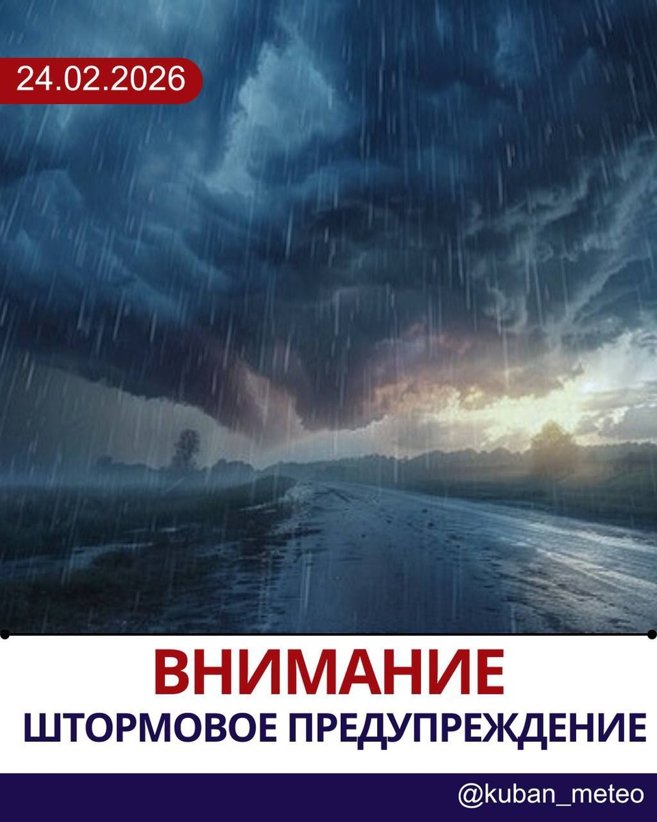 ☁️⛅⛈️ ‼️В Краснодарском крае объявлено штормовое предупреждение 🌀 🟥 Утром и до конца суток 25.02.2026 местами в Краснодарском крас (исключая муниципальное образование г. Сочи - зона прогнозирования ФГБУ «СЦГМС ЧАМ») ожидается комплекс метеорологических явлений: сильный дождь, ливень в сочетании с грозой и сильным ветром с порывами 20 м/с. 🟥 На юго-западных притоках р. Кубань и реках Черноморского побережья от Анапы до Магри ожидаются подъёмы уровней воды до неблагоприятных отметок и выше. Будьте внимательны и осторожны! С заботой, Краснодарский ЦГМС @kuban_meteo💙