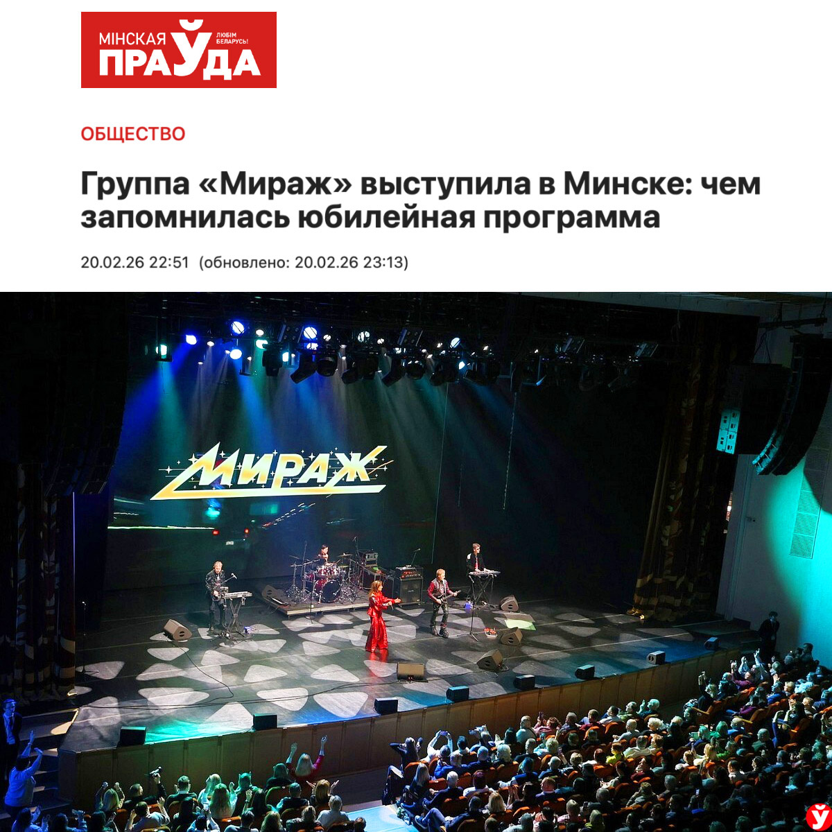 Легендарная советская и российская музыкальная группа «Мираж» выступила с аншлагом в КЗ «Минск», подняв зрителей с кресел. Коллектив подарил публике юбилейную программу «Музыка нас связала. Всё лучшее за 40 лет». Гитарист Алексей Горбашов и солистка Екатерина Болдышева дали интервью «МП» перед концертом.