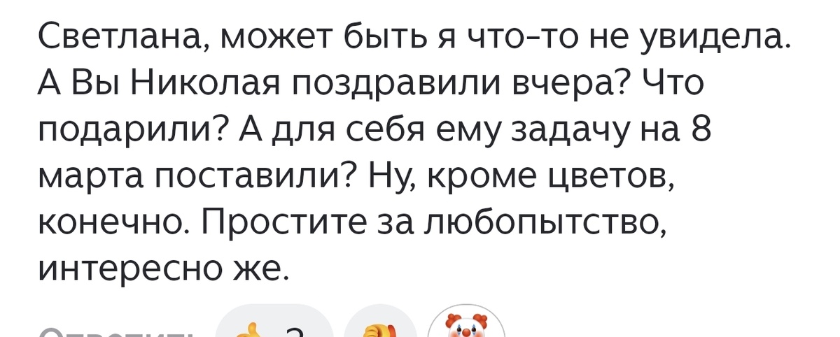 Задачу на восьмое марта я ему не ставила, потому что пока и сама не знаю, чего бы хотела. А Коле вдвойне сложнее, так как 10-го у меня ещё и День Рождения 😁.