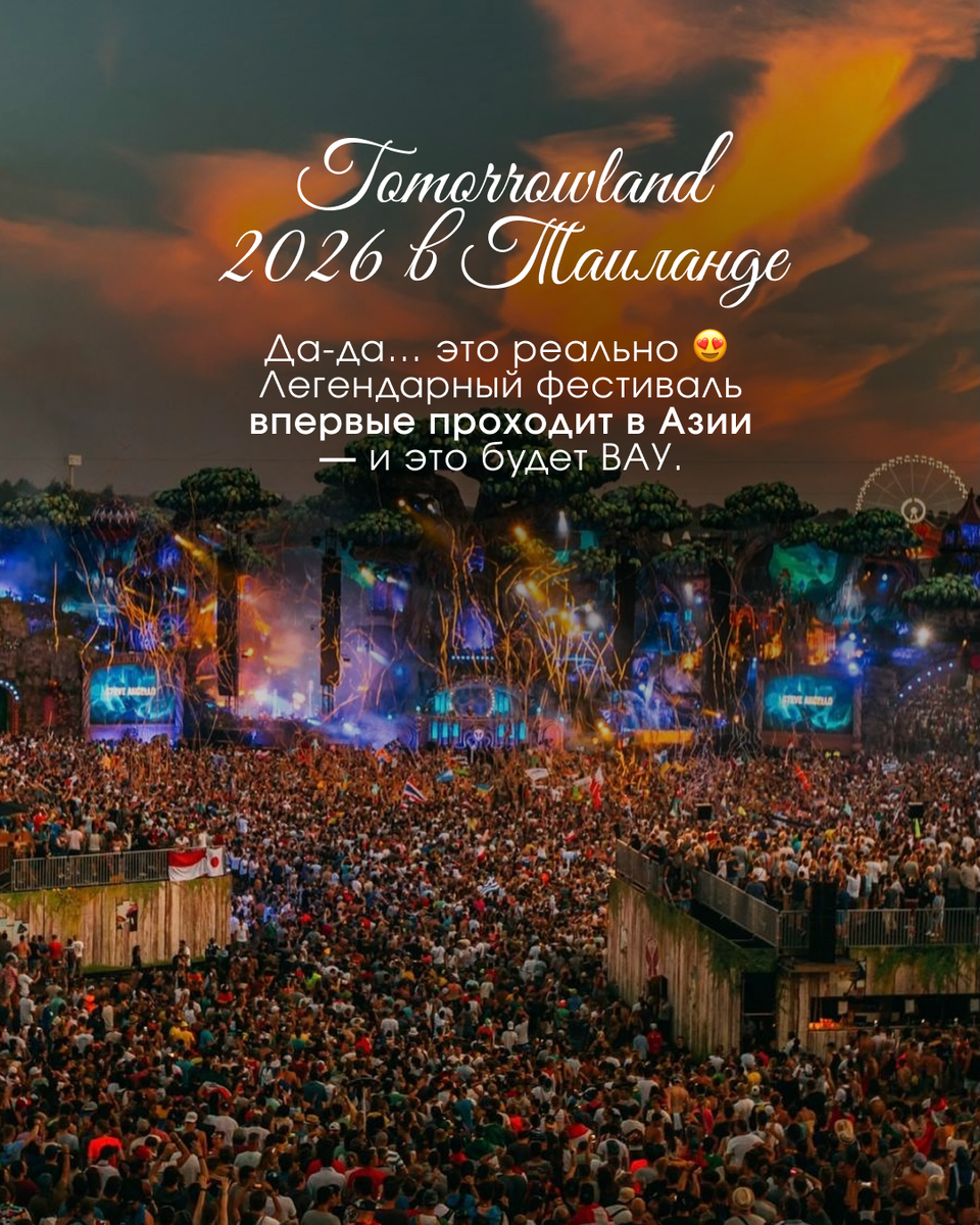 Да, вы всё правильно прочитали 😍 Tomorrowland официально впервые проходит в Таиланде - и это будет дебют фестиваля в Азии. Полный масштаб, фантазийные декорации, мощнейший звук, шоу мирового уровня и всё это в Паттайе! 📍 Где и когда? 🗓 11–13 декабря 2026 📌 Wisdom Valley, Pattaya, Thailand - новая outdoor-площадка, специально подготовленная под фестиваль. 🎧 Что вас ждёт? Это не просто «вечеринка с диджеями». Tomorrowland - это легенда электронной музыки и шоу, которое ощущается как отдельная вселенная: ✅ выступления мировых DJ ✅ гигантские сцены и постановка ✅ фантазийная атмосфера и сторителлинг ✅ эффект «я в кино, но это реальность» 🤝 Почему это большой старт для Таиланда? Фестиваль проходит в партнёрстве с Tourism Authority of Thailand, чтобы усилить туризм и сделать реально масштабное событие. 🏨 Про проживание В отличие от классического формата с кемпингом - здесь акцент на отельные пакеты, а значит можно совместить: 🌴 фестиваль + комфортный отдых + море 🎟 Билеты Tomorrowla
