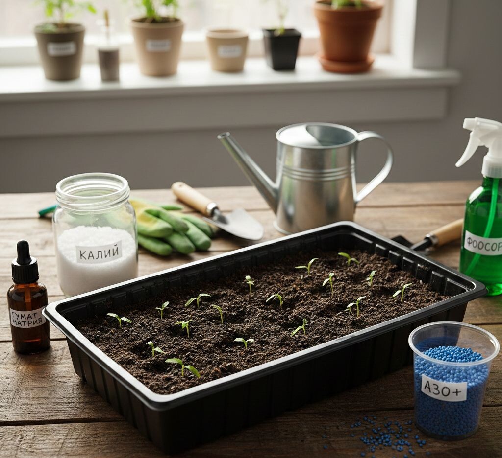 В хорошем грунте рассаде хватает питания до самой высадки. Я начинаю подкармливать только через две недели после пикировки, и то, если вижу, что листья бледнеют или рост тормозится. Первая подкормка — половинная доза удобрения.
