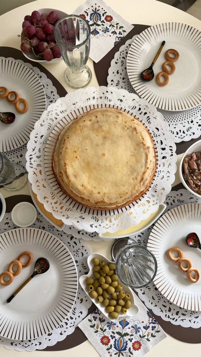 И снова пригодился декор, который я использовала в новогодней сервировке «а-ля рус» — ложки, сушки, салфетки. Круглые ажурные салфетки идеально по настроению подошли к блинчикам. А сервировочные с цветочным принтом добавили весеннего настроения. Эти салфетки, внешне напоминающие вышивку гладью, мне привезла из Польши сестра, когда ездила туда в командировку. Скажу честно, если бы не целлофановая упаковка, не признала в них бумажные салфетки — очень достоверная реплика тканных. Итак, чем потчевали гостей? Блинами, конечно! Но после супа. Кто подписан на меня давно, знает, что у нас ни одно застолье без супа не обходится. В это раз были щи из свежей капусты. А еще, помимо обычных, накрутили блинов с мясом. А к ним сделали соус: аджика + майонез + чеснок — всё на глаз и по вкусу. На фото ниже он слева. Блины с мясом с этим соусом — это просто бомбически вкусно. Соус молодежь оценила особенно, сказали, что даже вкуснее, чем во всяких «Всукноиточках». В общем, Зимушку проводили сытно, вк