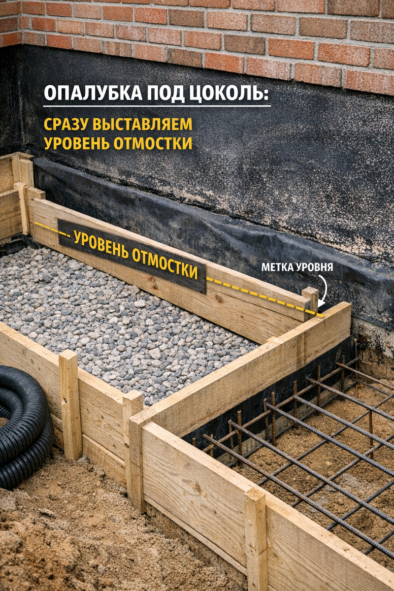 Одна из самых частых ошибок на частной стройке — цоколь «по месту», без привязки к будущей отмостке и планировке участка. Пока дом в коробке — всё выглядит нормально. А потом появляется засыпка, отмостка, дождь… и вода начинает лететь в стены. Именно так возникает классическая «цоколь низкий проблема» — когда уровень фундамента изначально заложен без учёта рельефа и будущей отметки земли. Разберём, как правильно выставить опалубку под цоколь, чтобы высота цоколя отмостка работала вместе, а не конфликтовала. Особенно актуально это для Таганрога и Приазовья, где ливни и ветровая вода — не редкость. Часто цоколь делают «по стандарту»: 30–40 см над текущей землёй. Без анализа будущей планировки. Но участок после строительства почти всегда меняется: — поднимается грунт;
