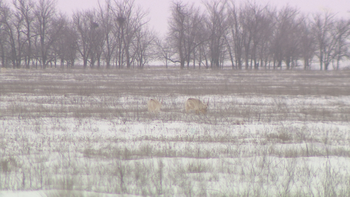 В Заволжье отмечают рост популяции сайгаков. За краснокнижных животных можно порадоваться. Но вот аграрии бьют тревогу. Начиная с прошлого года они фиксируют потраву посевов. Значительный ущерб понесло сельхозпредприятие в Ленинском районе. В поселке Маяк Октября побывала наша съемочная группа. В снежной пелене камера не различит, а глаз видит, удаляются темноватые пятна – стада сайгаков. Вот их свежие следы, здесь они копали-щипали травку. Для кого-то достопримечательность, биоразнообразие, для кого-то головная боль. Парнокопытное млекопитающее из семейства антилоп со смешным и уникальным носом-хоботком. С древности полноправный обитатель степей и полупустынь. В наше время сайгаки едва не исчезли с лица земли. Бесконтрольную добычу рогов и мяса удалось остановить. Они в Международном Красном списке и Красной книге России. Теперь в Заволжье исчезать стал урожай. Степь большая, но такой компании прокормиться непросто. Вот и захаживают на поля многотысячные стада, потеряли страх. Сельхоз