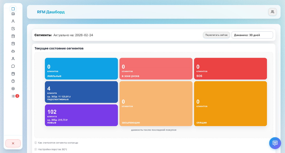 • Кто-то давно не записывался — напомнить или не трогать? • Кто-то был один раз — как вернуть на второй визит? • Кто-то приходит часто — что предложить, чтобы не потерять? • Рассылки идут всем одинаково, а отклик — у единиц. RFM-дашборд в Красотуле решает именно эту задачу. ❌ Что было: • Все в одной куче — нет ясности, кто и что хочет • Решения «на глаз» — кого звать, кому что предлагать • Одинаковые сообщения всем — часть не релевантна • Понятно только в Excel — долго, с ошибками, без динамики ✅ Что делает RFM-дашборд: • Раскладывает базу на 7 сегментов: лояльные, в зоне риска, SOS, перспективные, засыпающие, новые, спящие • Даёт подсказку по каждому сегменту: что предложить и как работать • Показывает конкретных клиентов — клик по ячейке, и видно, с кем что делать • Позволяет отправлять рассылки точечно — разный текст и оффер разным сегментам • Считает давность, частоту и выручку сам — заказы и записи уже учтены • Показывает, как сегменты меняются со временем — видно, работает ли ст