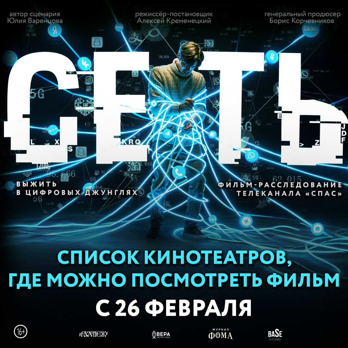 Список кинотеатров, где покажут новый фильм «СПАСА» — «Сеть» Представляем вам список кинотеатров, где можно будет посмотреть наш новый фильм, начиная с 26 февраля. На сегодняшний день прокат уже подтвердили 52 кинотеатра, список пополняется: Фильм-расследование «Сеть» расскажет о том, как спастись самим, а также защитить детей и подростков от разрушительного влияния цифрового цунами. Информационные партнеры проекта: Радио ВЕРА, Радио «Радонеж», платформа «Смотрим».