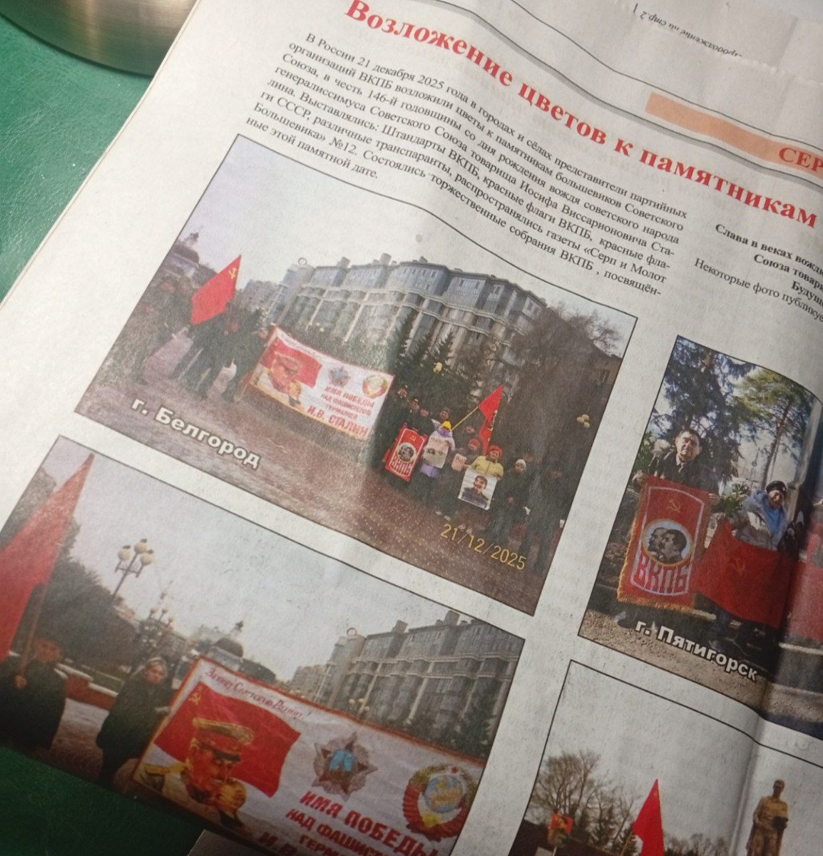 Публикация в дружественном издании фотоотчёта с возложения цветов в Белгороде к месту где ранее располагался памятник Сталину, 21 декабря 2025 года, в котором принимал участие и я.