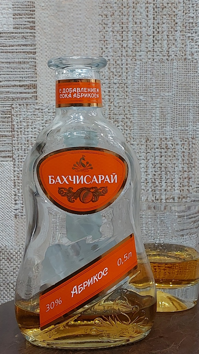 · Что внутри: По сути, это коньячный напиток на основе трёхлетнего коньяка "Бахчисарай" с добавлением абрикосового экстракта . Крепость щадящая - 30% . Золотисто-янтарный цвет радует глаз .