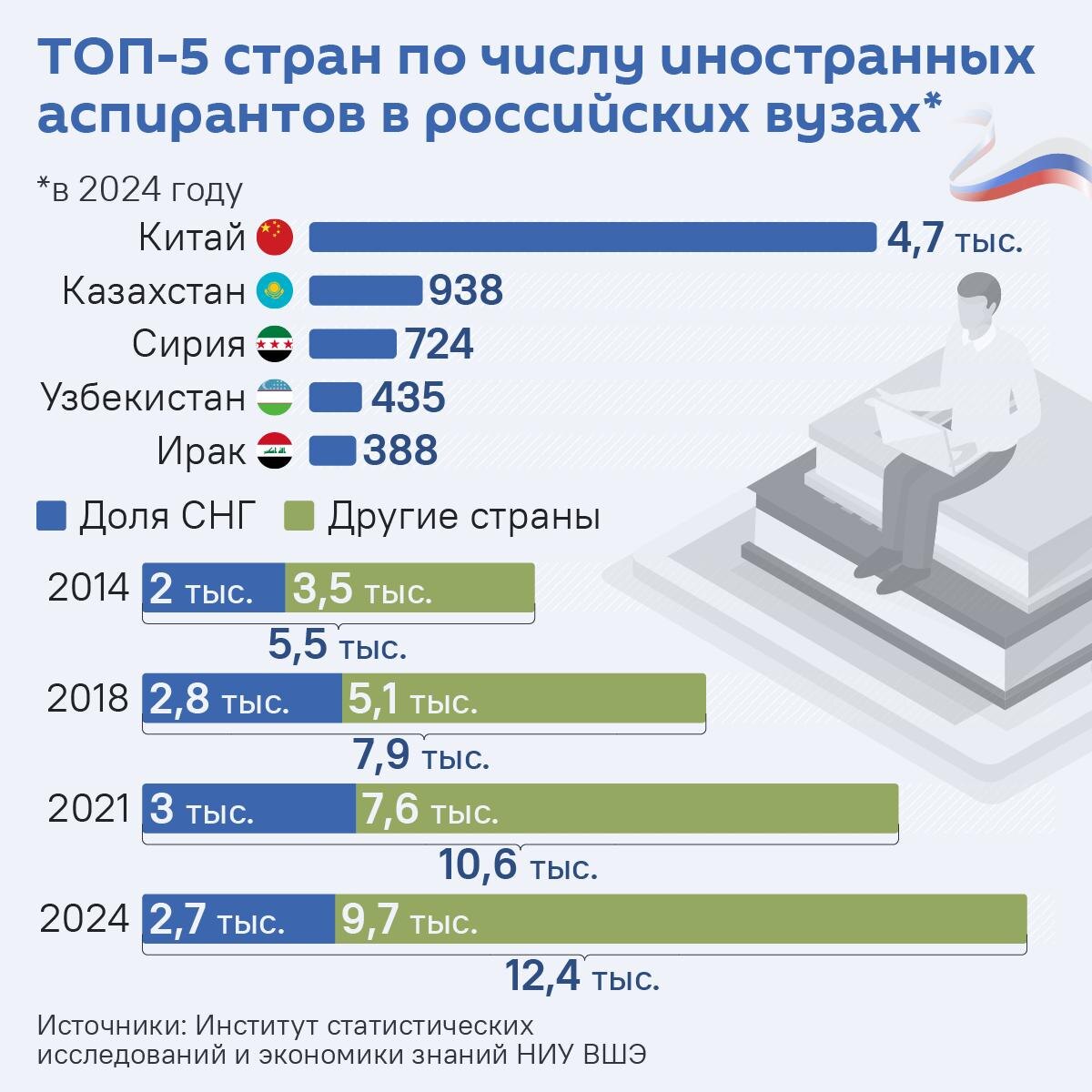 Казахстан и Узбекистан вошли в число лидеров по количеству аспирантов в российских вузах. За последние 10 лет число иностранцев на таких программах в РФ выросло почти вдвое, достигнув 12,4 тыс. человек. Первое место удерживает Китай: в 2024/25 году обучается 4,7 тыс. аспирантов из КНР (39% от общего числа). Высокий спрос традиционно сохраняется и в странах СНГ. Абитуриентов из Центральной Азии привлекают отсутствие языкового барьера, понятные требования и возможность получить высокую научную квалификацию.