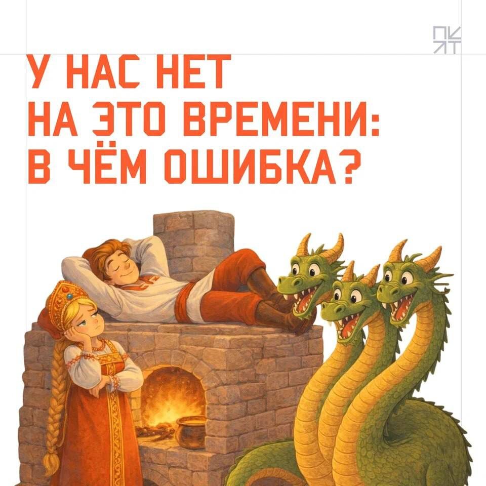 🎓 Уже посмотрели вебинар (https://t.me/pptrf_ru/4618) Академии производительности ФЦК «У нас нет времени на улучшение: ответ на главное возражение»? А ведь у нас тоже есть что сказать по этой теме. Но, чтобы объяснить теорию «на пальцах», не изменяя своим традициям, мы обратимся к русским сказкам. Что же стоит за фразой «нет времени»? Вы удивитесь: три классических сказочных сюжета. 1️⃣ Иван-дурак на печи (или системный пожарный) Симптом: человек лежит на печи, вокруг всё горит, солома трещит, а он стонет: «Охо-хо, дел полно, печь подлатать надо, крышу покрыть, а времени – ну совсем нет!» Суть: налицо отсутствие приоритетов. Иван занят горением, но не развитием. Ему проще героически тушить пожары и жаловаться, чем слезть с печи и один раз починить крышу. Работа с возражением: Иван, а давай применим «правило топора»: потратим час на заточку, чтобы потом 10 часов не мучиться? Пока ты на печи лежишь, у тебя избушка развалится. Слезай, найдем тот угол, который подпереть надо в первую очер