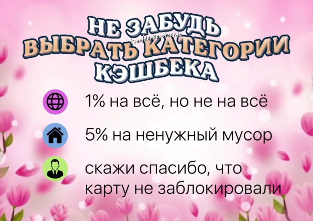 Так быстро проходит время - даже не заметила, что уже наступил конец месяца, и снова пора выбирать категории кэшбека. А всему виной годовая отчетность - наши законотворцы не могут жить без того, чтобы не придумать для бухгалтеров очередные новшества (может их когда-то сильно обидел бухгалтер....). И в этот раз не обошлось без новшества. Так все выходные сочиняла пояснительную записку для бух. баланса - а еще говорят, что у бухгалтеров работа не творческая) Но что же, немного поныла) А теперь за дело - приступаю к выбору кэшбека на апрель. В марте, да и в феврале приятно удивил ВТБ выбором категорий. И судя по комментариям, такие хорошие категории были только у меня. В этот раз все не так радужно, но и не совсем печально. Почему-то совсем не было к выбору категории с повышенным кэшбеком на супермаркеты в городе. С учетом разовых акций всегда получалось очень выгодно. Из всех предложенных вариантов выбрала: Кстати, сейчас в Т-банке есть каждый день кэшбек 100% на товары. Пользуетесь? Зд