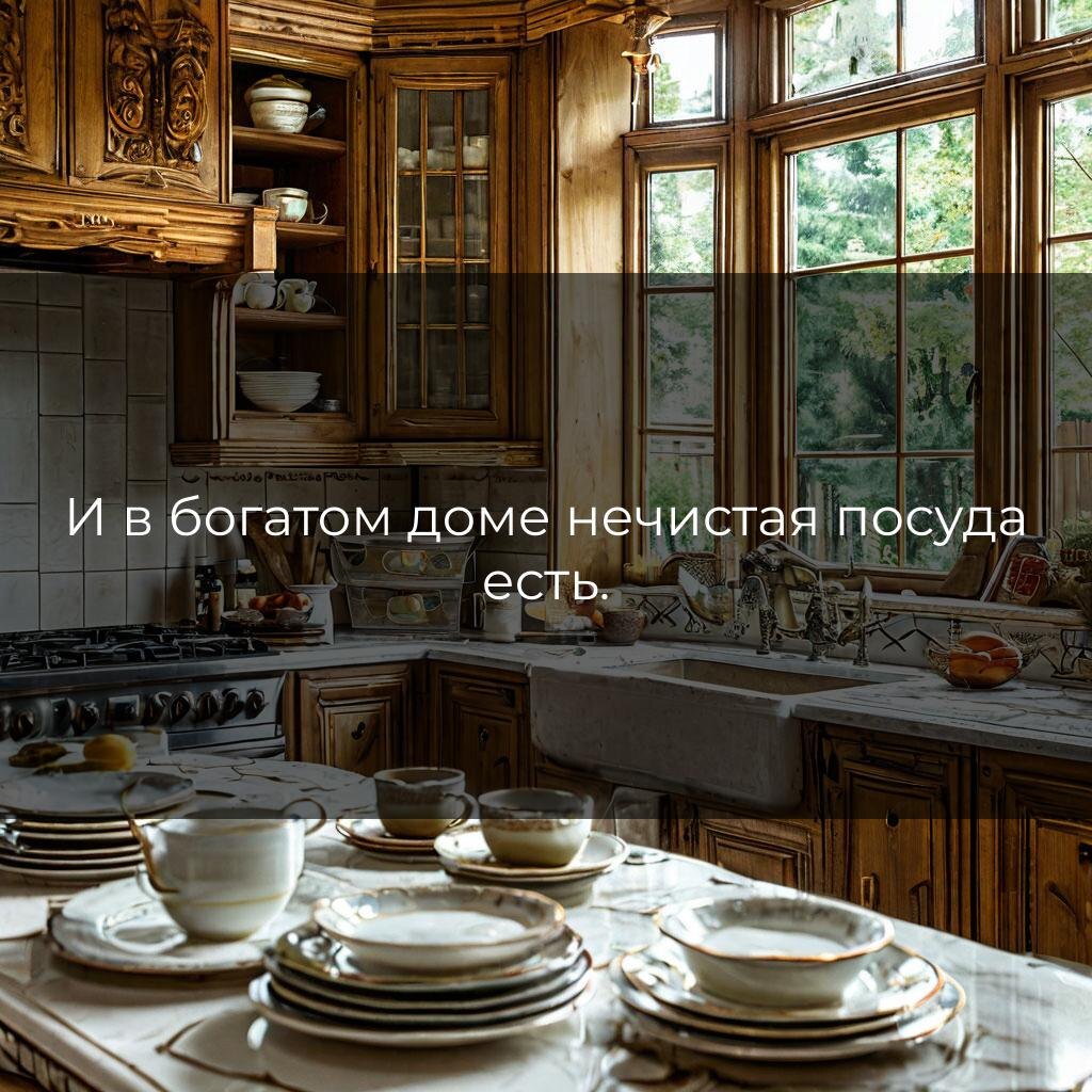 Эта мудрость подчеркивает, что идеал недостижим, даже в условиях, которые кажутся безупречными. � В богатом доме, где, казалось бы, всё должно быть идеально, можно обнаружить несовершенства, например, грязную посуду. Это напоминание о том, что опрятность — понятие относительное, и даже в самых ухоженных местах могут быть изъяны. Исторически пословица отражает социальную иронию: богатство не гарантирует абсолютного порядка, а бедность — не синоним беспорядка. 🏰➡️🧹 Она высмеивает стереотипы о том, что внешний блеск всегда соответствует внутреннему содержанию. В быту это можно наблюдать, когда в доме, где всё сияет, вдруг обнаруживается забытая чашка в раковине. Или когда в офисе с дизайнерским ремонтом сотрудники забывают убрать за собой после обеда. 🥴 Применять эту мудрость уместно, когда кто-то слишком строго судит других за мелкие недочеты, забывая, что никто не идеален. Она также полезна для самоиронии, когда мы сами стремимся к недостижимому совершенству. Поделитесь этой ирон