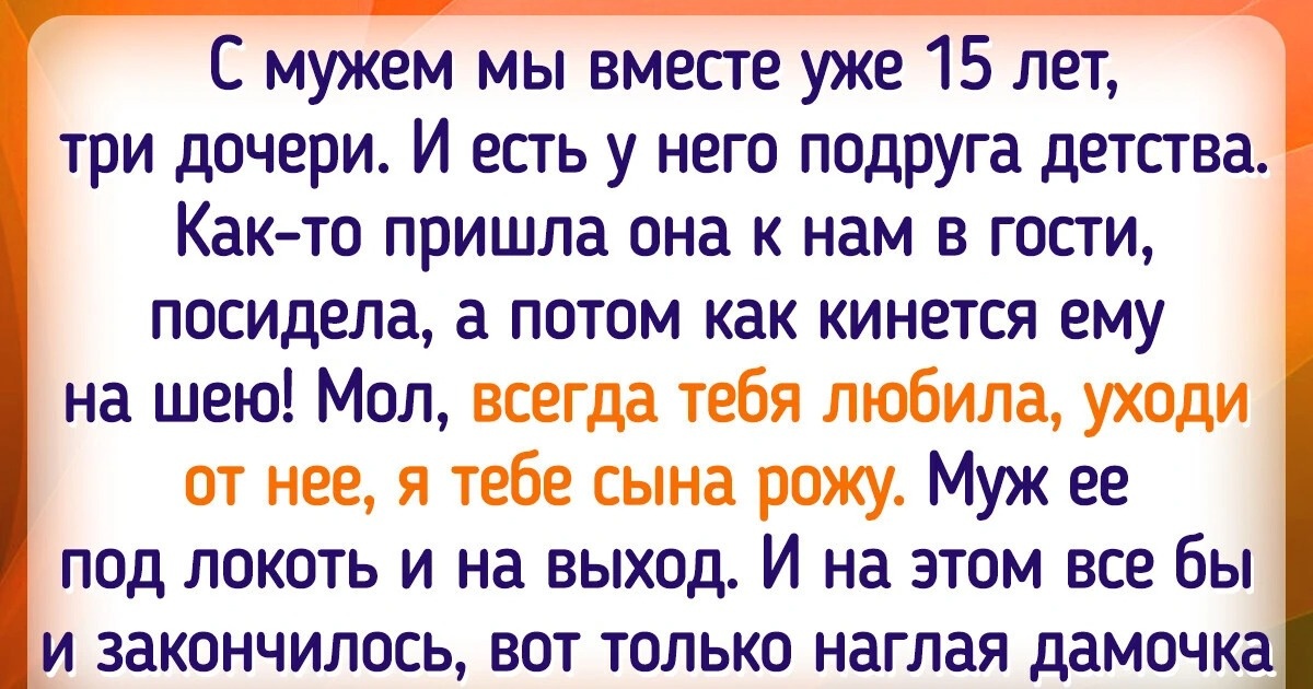 С мужем мы вместе уже 15 лет, три дочери. И есть у него подруга детства. Как-то пришла она к нам в гости, посидела, а потом как кинется ему на шею! Мол, всегда тебя любила, уходи от нее, я тебе сына рожу. Муж ее под локоть и на выход. И на этом все бы и закончилось, вот только наглая дамочка нажаловалась своей мамаше. А мамаша — давняя приятельница моей свекрови. Приятельница закатила свекрови скандал, как же, ее деточку не любят и не ценят, и порвала отношения. 30 лет дружбы коту под хвост.