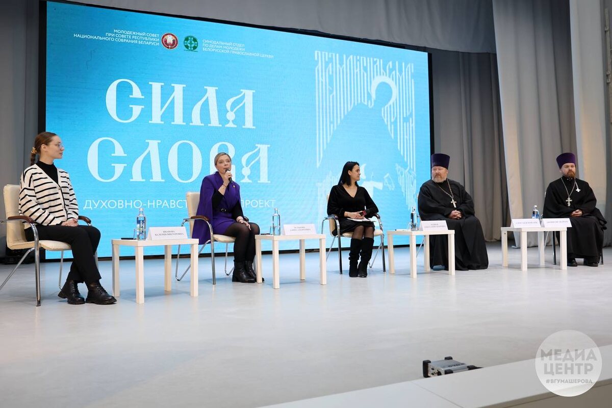 М. Машерова была организована диалоговая площадка «Семья: ответственность, традиции и ценности современной молодежи» для студентов и лицеистов университета 🗣Мероприятие проходило в рамках духовно-нравственного проекта «Сила Слова». В роли спикеров выступили организаторы проекта – представители Молодежного совета при Совете Республики Национального собрания Республики Беларусь и Белорусской Православной церкви: 🔵Председатель Молодежного совета при Совете Республики Национального собрания Республики Беларусь Алина Ретькова; 🔵Член Молодежного совета при Совете Республики Национального собрания Республики Беларусь Ольга Млявая; 🔵Член Молодежного совета при Совете Республики Национального собрания Республики Беларусь Валерия Иванова; 🔵Заместитель руководителя молодежного отдела Витебской епархии протоиерей Александр Ковалев; 🔵Проректор по воспитательной работе Витебской духовной семинарии иерей Дионисий Андреев. Цель проекта заключается в духовно-нравственном воспитании молодежи Рес