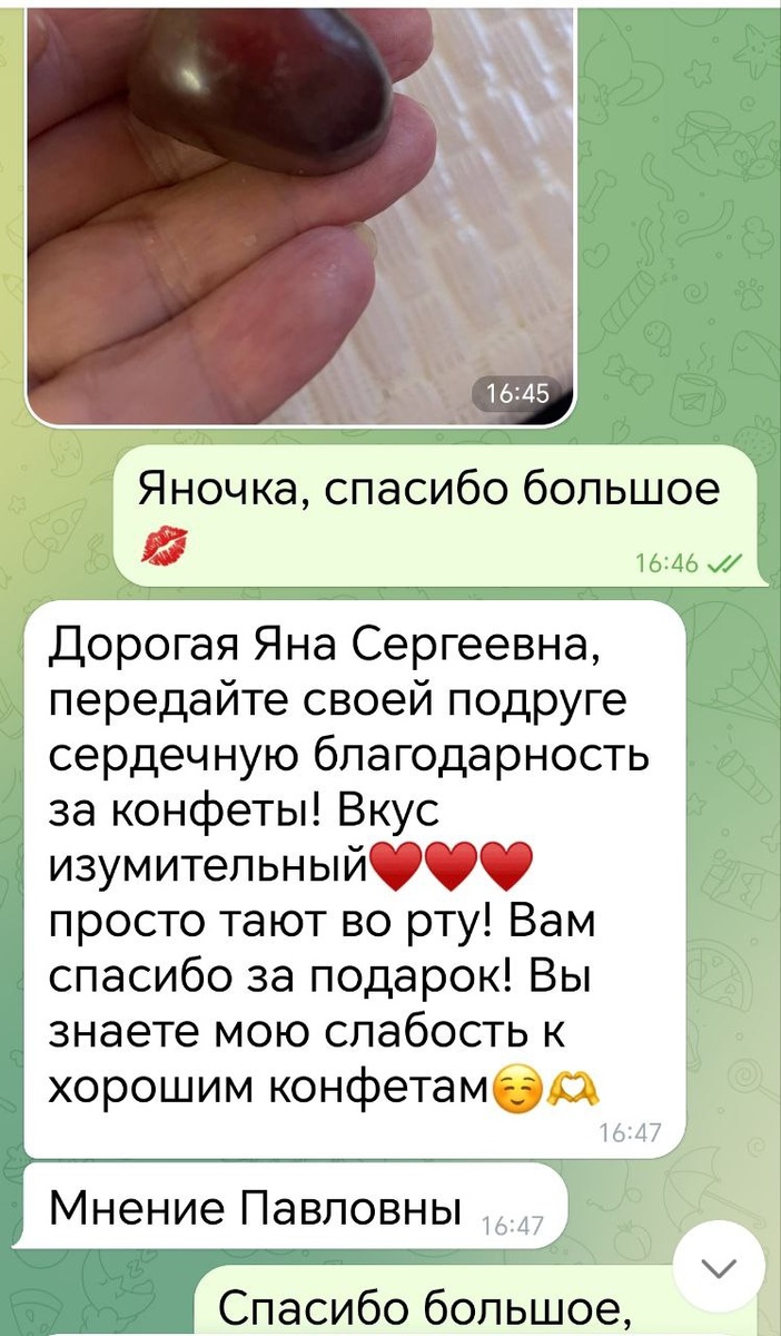 Друзья, всем доброго вечера❗ В нашем канале работает бот, который "наводит порядок" и удаляет спам. На самом деле спама нет, но он удаляет и ваши комментарии, что, конечно, обидно 😲 Поэтому, я решила сделать скрин и поделиться отзывом, который мне написала подруга, подарив своей коллеге коробочку конфет 🤗.