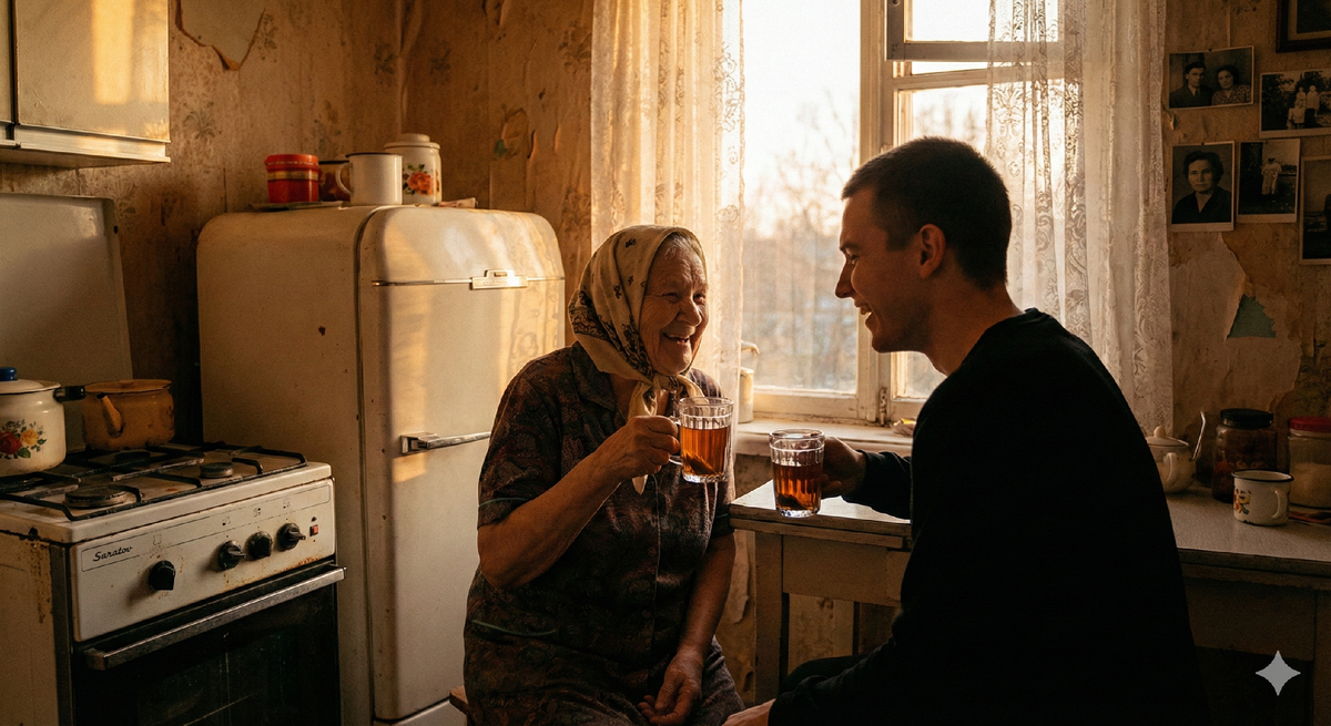 Я приехал к бабушке Зине на майские — как обычно, с тортом и пустыми руками в плане планов. Она накормила, налила чаю, и мы просто разговаривали. Она любит вспоминать — не с тоской, а спокойно, как человек, у которого с прошлым всё в порядке.